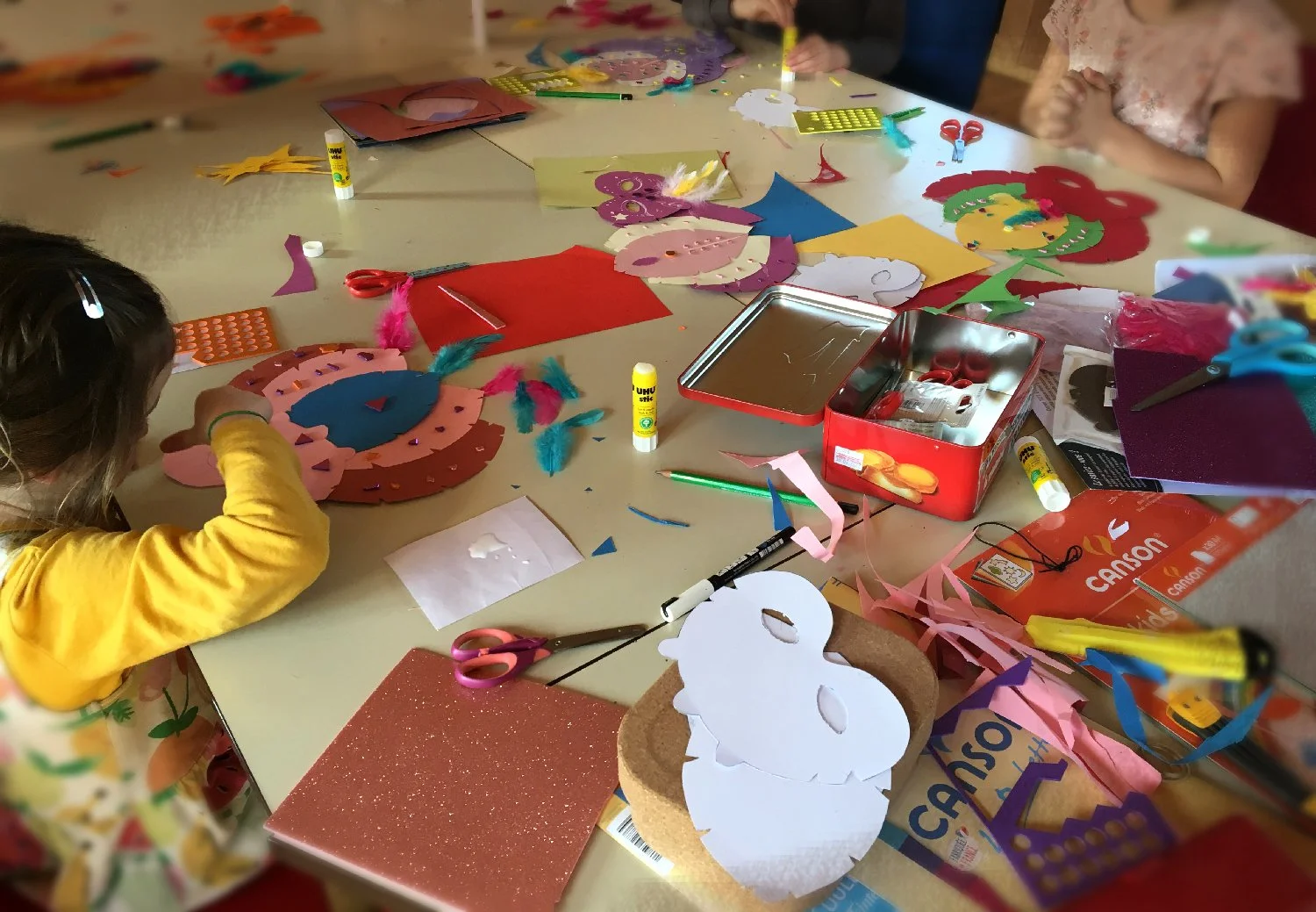 Création de masques de Carnaval en divers matériaux (papiers colorés, plumes, brillants, crayons etc…)