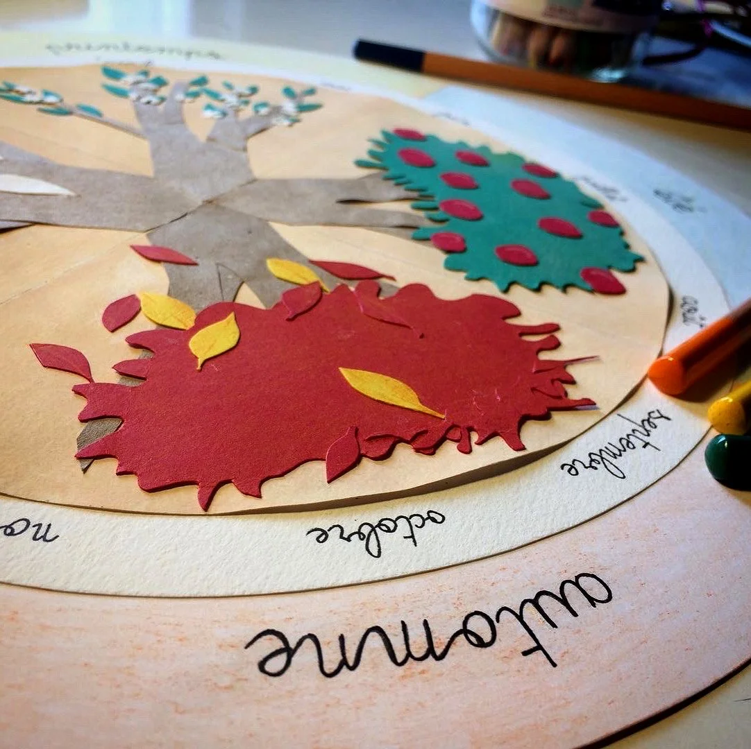 Création d’une roue des saisons, d’inspiration Montessori, en papiers colorés découpés et crayons de couleurs.